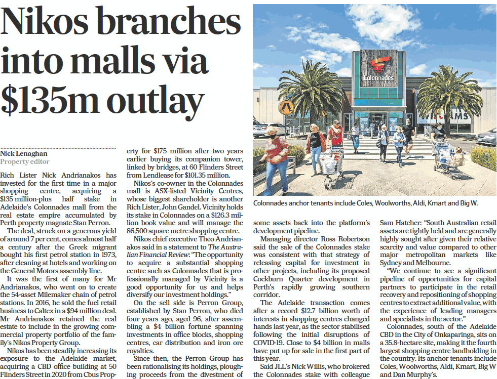 “The opportunity to acquire a substantial shopping centre such as Colonnades that is professionally managed by Vicinity is a good opportunity for us and helps diversify our investment holdings,” Nikos chief executive Theo Andrianakos said in a statement to The Australian Financial Review.
